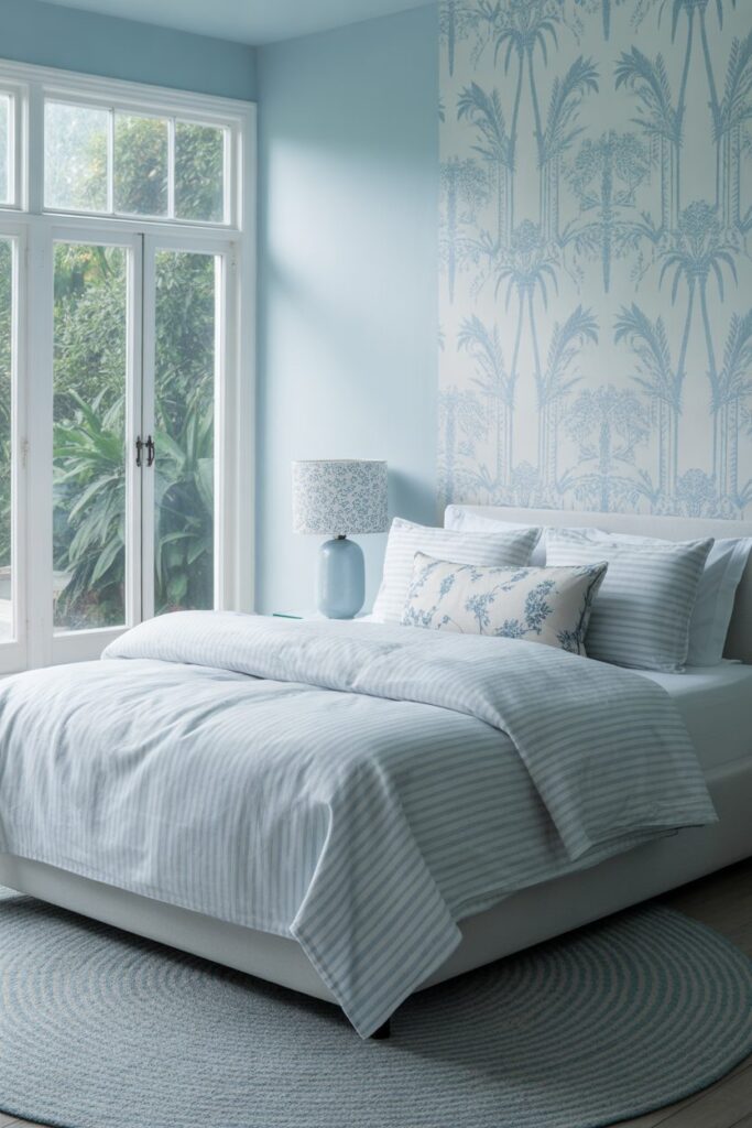 Patterns can add personality to a light blue bedroom without taking away from its calm feeling. Striped bedding gives a neat and classic touch, while floral designs bring softness and charm. A patterned rug can anchor the space and add movement to the floor area. Even a subtle patterned wallpaper in a light blue shade can create a feature wall that draws attention in a gentle way. These Light Blue Bedroom Ideas show that adding design details can make the room feel more lively while keeping the peaceful tone intact.