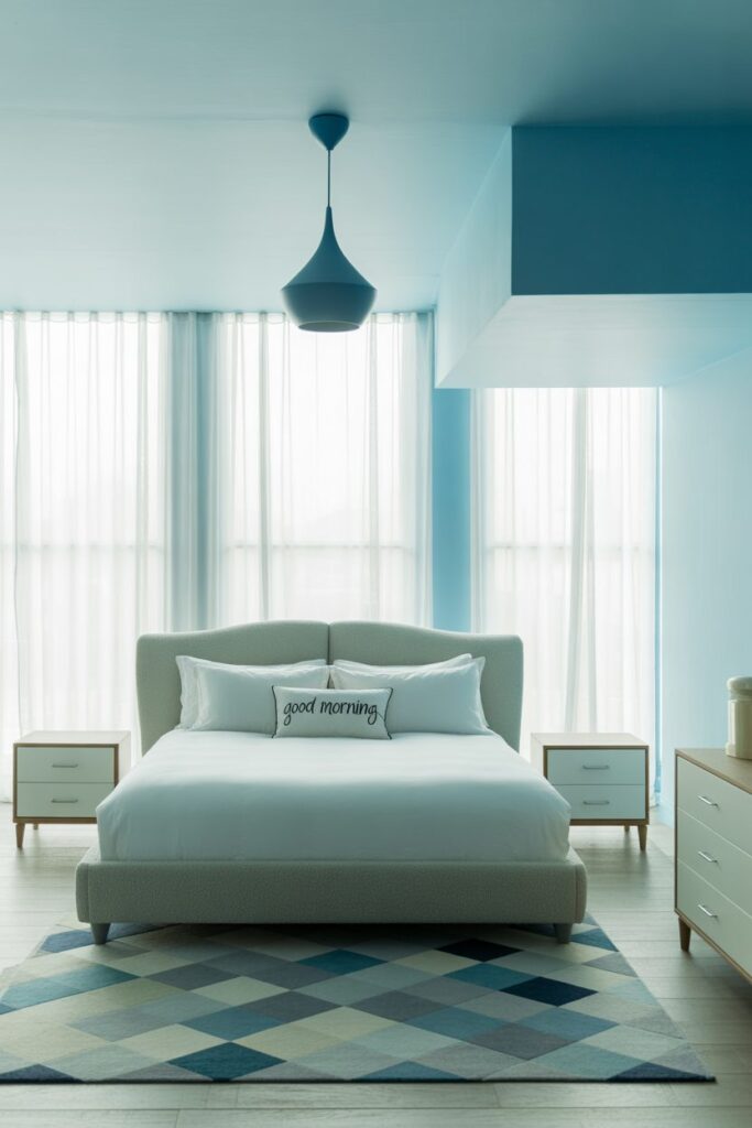 Modern Light Blue Bedroom Ideas focus on simplicity and clean design. Instead of filling the room with too many items, the goal is to keep things streamlined while still adding personality. A single light blue accent wall can serve as a focal point without dominating the room. Pair it with neutral furniture in white, grey, or beige to maintain balance. Contemporary lighting fixtures, such as minimal pendant lights, help refine the look. Adding geometric patterns through rugs or throw pillows introduces visual interest while keeping the overall design polished and uncluttered.