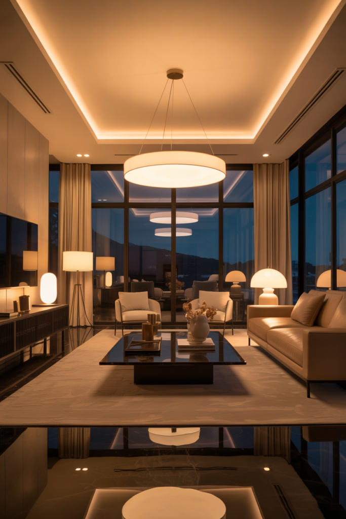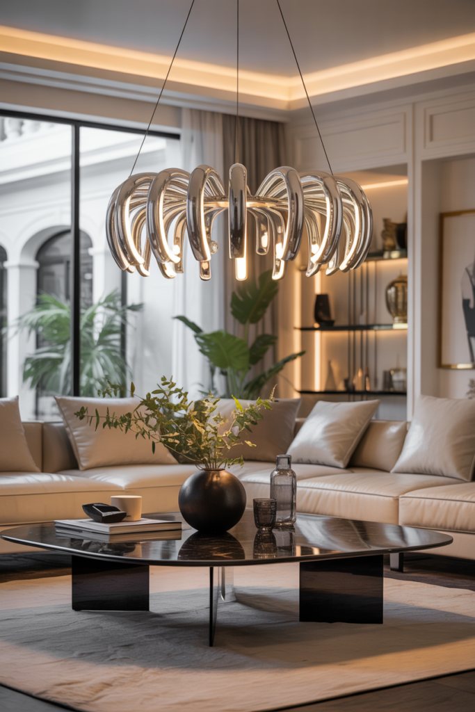 Statement pendant lights or contemporary chandeliers make great focal points. Large pendant lights over seating areas or coffee tables combine style and function, creating a warm and intimate ambiance when paired with softer ambient lighting.