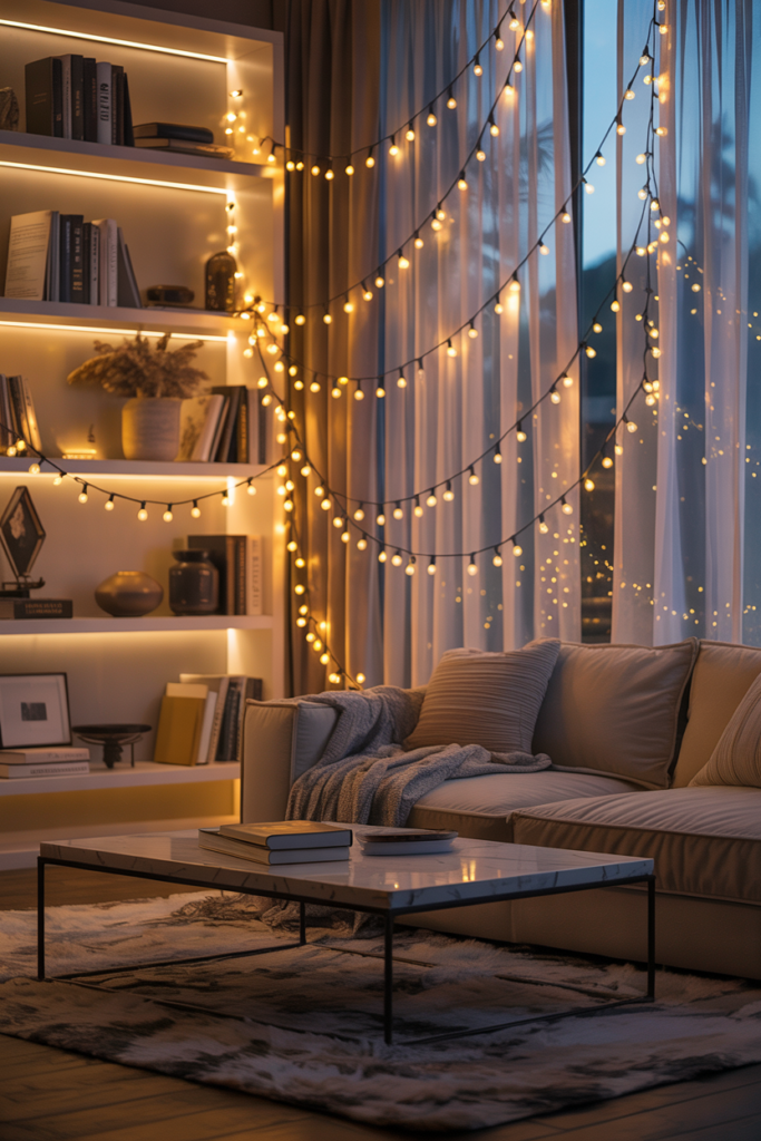 Fairy string lights work especially well for soft, ambient lighting and can be placed along bookshelves or behind sheer curtains. For a bolder approach, outline windows or doorways with string lights to add a magical, whimsical feel to your living room.