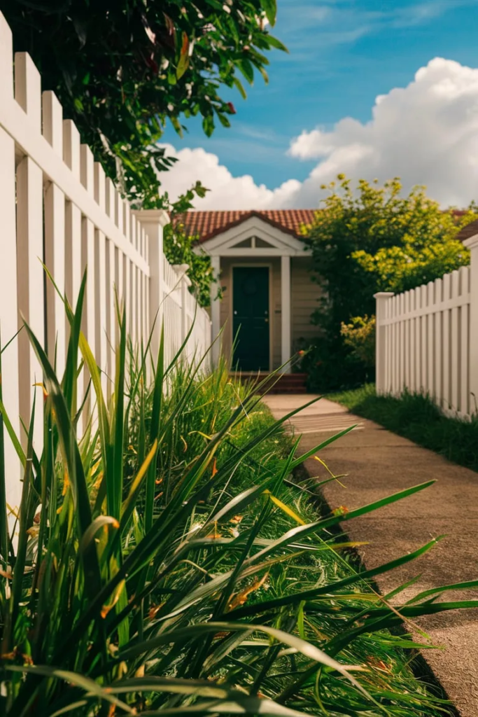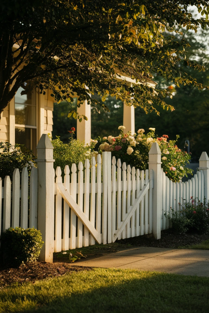 A white picket fence is a timeless choice that complements traditional and cottage-style homes. Its vertical slats provide structure without blocking views, and pairing it with flowers enhances its charm. Regular maintenance like painting keeps it looking fresh.