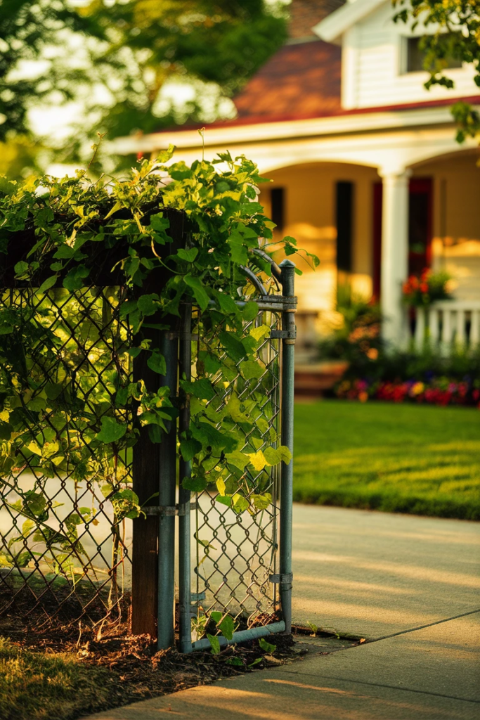 Chain-link fences become more attractive when combined with plants. Climbing vines or hedges transform them into lush, budget-friendly options that blend urban and natural elements.