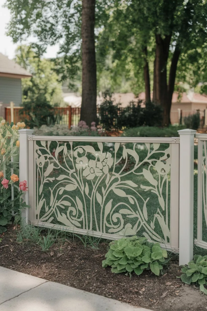 Laser-cut metal fences feature artistic patterns, from geometric shapes to nature-inspired designs. Bold paint can highlight the artwork, turning the fence into a modern, eye-catching feature for your yard.