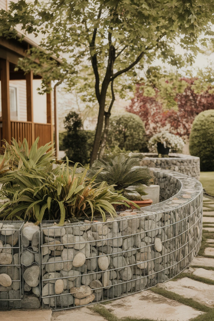 Gabion fences, made of stone-filled wire cages, create a bold, modern statement. They are durable and customizable with different stones, and adding wood or plants can enhance the design. Best suited for contemporary landscaping and sloped yards.