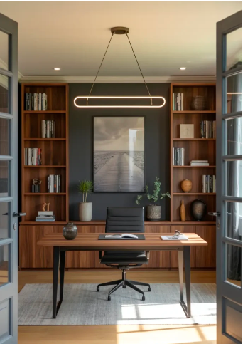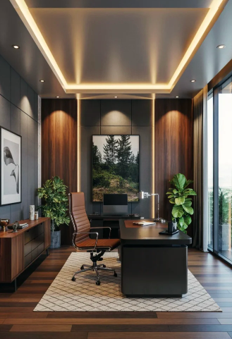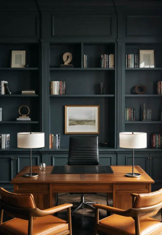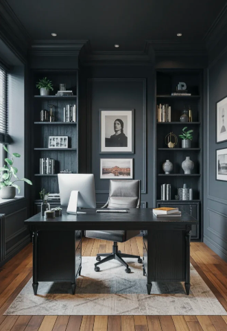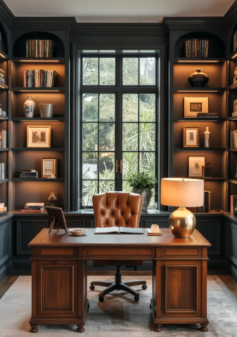 For a sleek, elevated workspace, dark-paneled walls, refined lighting, and sculptural desks create a bold and simple environment. Streamlined furniture, moody art, and curated accessories contribute to a powerful yet personal feel. This approach works seamlessly alongside modern luxury living room styles, keeping the aesthetic cohesive throughout the home.