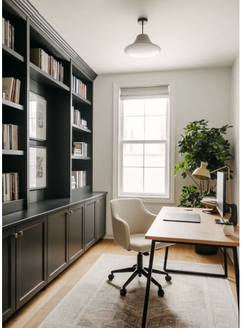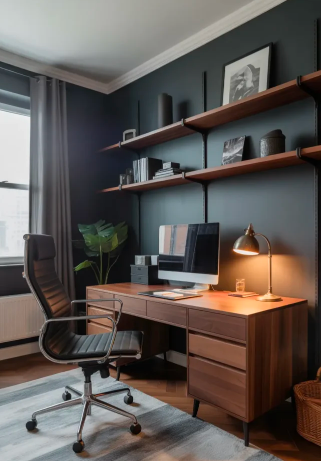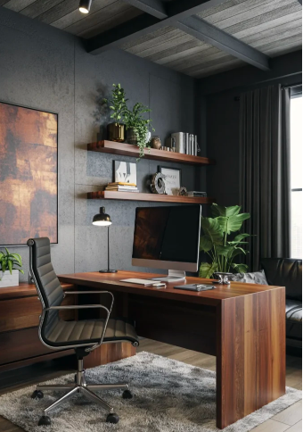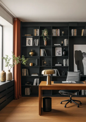 A curated look with clean-lined desks, matte shelving, and a monochrome palette feels magazine-ready. Terracotta or rust-toned accents add warmth, while brass lighting provides a refined shine. This setup achieves a calm, masculine aesthetic that balances elegance with practicality.