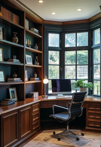Dark built-in bookcases lining the walls enhance a room’s sense of luxury and organization. Even without a vast library, these shelves can hold framed art, neatly arranged papers, and curated accents. Symmetry and intentional styling create calm and control, making it easier to focus while keeping the space cohesive and masculine.