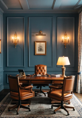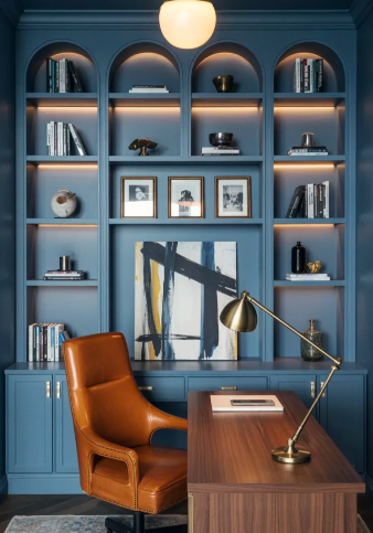 Blue-gray built-ins, layered artwork, and tan leather accents offer a contemporary masculine feel. Incorporating pieces you love makes the office personal and inspiring. Thoughtful styling ensures the space is functional for both work and relaxation, while cozy elements like rugs and chairs make shared spaces welcoming.