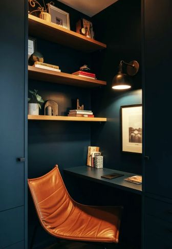A small, moody corner with floating shelves and a comfortable lounge chair doubles as a reading spot and workspace. Compact leather chairs and thoughtful layout make this setup ideal for apartments or secondary work areas. Keeping essentials like books and throws within reach ensures comfort and function while maintaining a masculine aesthetic.