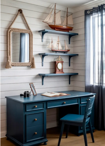 Navy-painted desks, model ships, and rope details bring a maritime influence to a home office. Combining wood, brass accents, and subtle shiplap creates a warm, collected style. This approach adds classic charm with unexpected personality, perfect for a masculine office with a heritage-inspired edge.