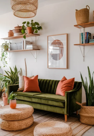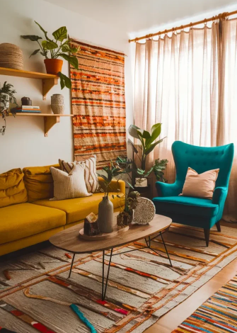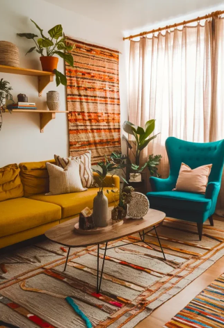 Bohemian living rooms can embrace bright, lively colors effortlessly. Layered rugs, patterned pillows, and rattan furniture paired with vibrant wall colors create a playful and eclectic atmosphere. A mustard yellow sofa or teal armchair can serve as a focal point, while houseplants add extra energy. Tropical-inspired touches also work beautifully in this vibrant boho style.