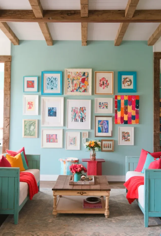 Farmhouse living rooms don’t have to stick to neutral tones. Painted furniture and colorful gallery walls can bring life to rustic interiors. Soft blues and greens, like sage, complement warm wood tones to maintain coziness while adding vibrant charm. These touches make the space feel bright, welcoming, and modern.