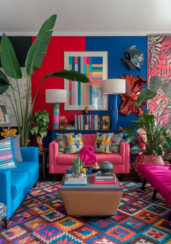 Maximalist living rooms thrive on bold patterns, layered rugs, and eclectic decor. Combining vibrant art, colorful furniture, and oversized plants creates a dynamic, personality-filled space. Layering colors and textures in this way makes the living room feel unique, dramatic, and fully expressive of your style.