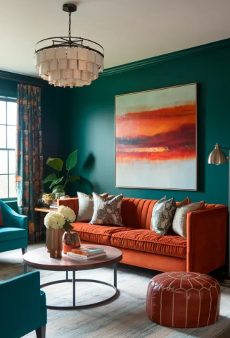 Blending retro elements with modern design works beautifully with bold colors. A 70s-style orange sofa or patterned rug combined with contemporary lighting creates a balanced, playful space. Using one style as a foundation and layering contrasting pieces gives the room depth, character, and modern colorful charm.