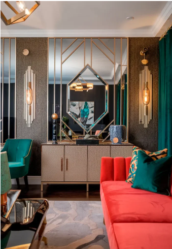 Art Deco interiors can combine glamour with playful color choices like coral or emerald. Velvet furniture, metallic accents, and geometric patterns modernize the classic style. Symmetrical layouts and metallic finishes maintain cohesion, giving the modern colorful living room a polished and elegant aesthetic.