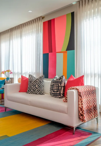 A white sofa can act as a striking contrast in a colorful living room. Pairing it with vibrant pillows, a bold throw, and an eye-catching rug makes the surrounding colors pop. Colorful artwork on the walls ties the look together while keeping the space inviting and balanced.