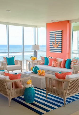 Modern nautical interiors go beyond soft blues and whites by adding coral, turquoise, or sunny yellow. Striped rugs or nautical-inspired artwork bring energy and visual interest. Natural light enhances the vibrancy of the colors, creating a cheerful and lively modern colorful living room.