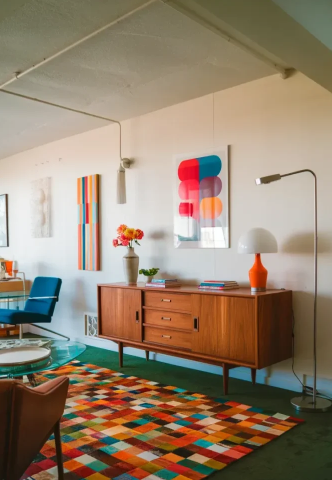 Mid-century modern spaces gain personality when paired with colorful accents. Clean-lined furniture combined with a burnt orange chair or turquoise coffee table creates a lively and inviting atmosphere. A statement geometric rug can tie the design together, adding a playful yet cohesive element to the modern colorful living room.