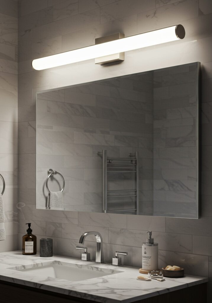 I usually follow a simple rule: keep the fixture about 70–75% the width of the mirror. This creates balanced lighting without overpowering the space. It’s a small detail, but it makes a big visual difference.