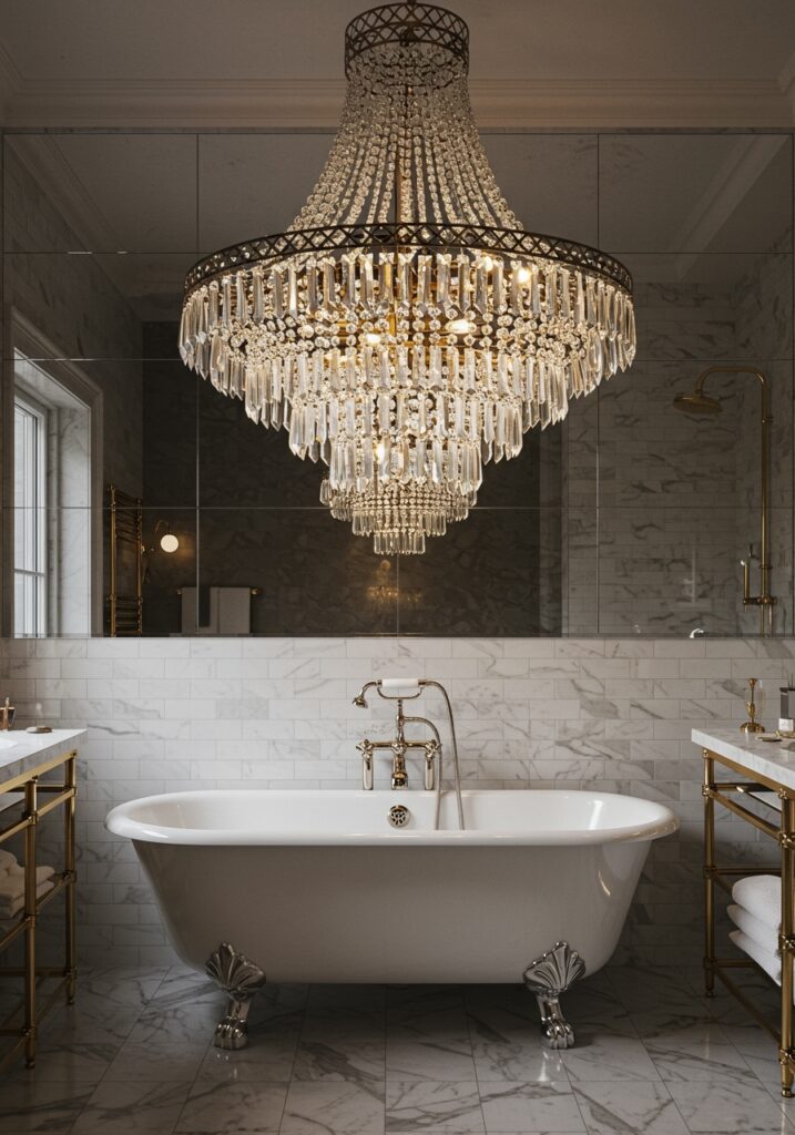 Adding a chandelier completely changes the feel of a bathroom. I’ve seen even simple spaces look luxurious with the right fixture.