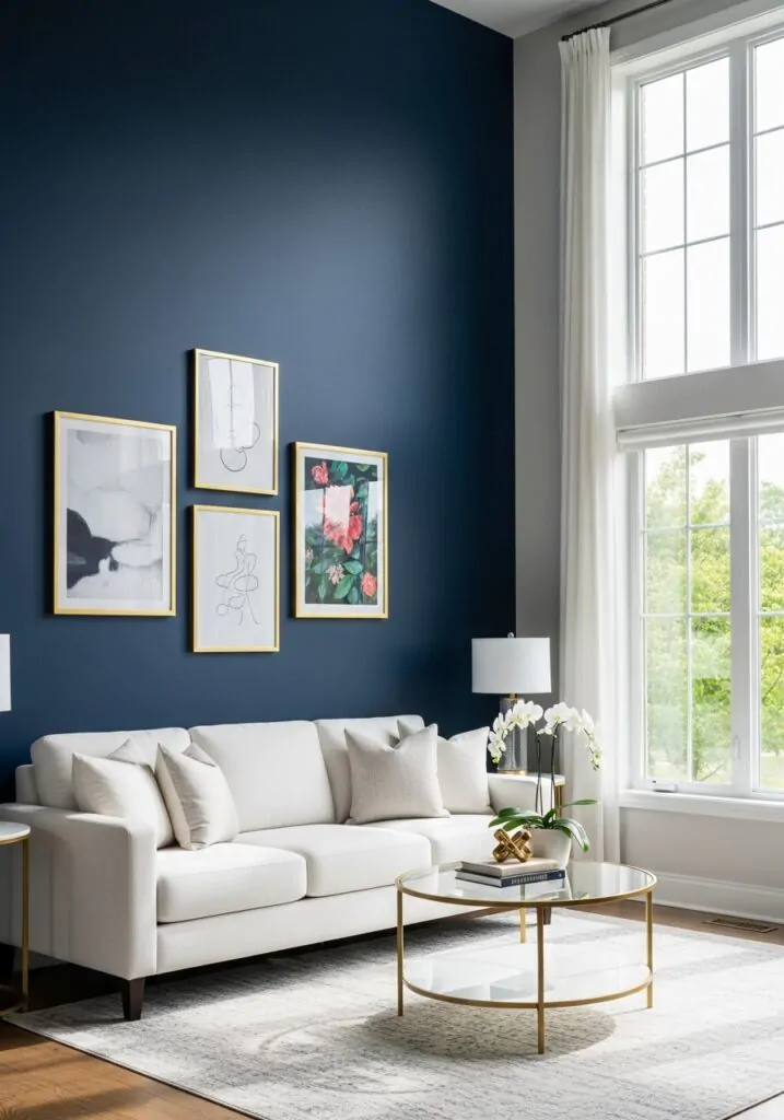 White and navy together create a timeless balance. White keeps the room bright and open, while navy adds definition and elegance. This contrast works especially well in living rooms where you want a clean, classic look that won’t feel outdated over time. Whether navy appears on the walls or furniture, white elements help break up the depth and maintain visual clarity.