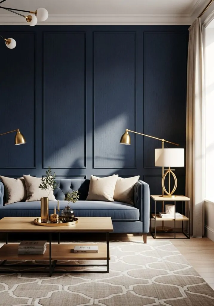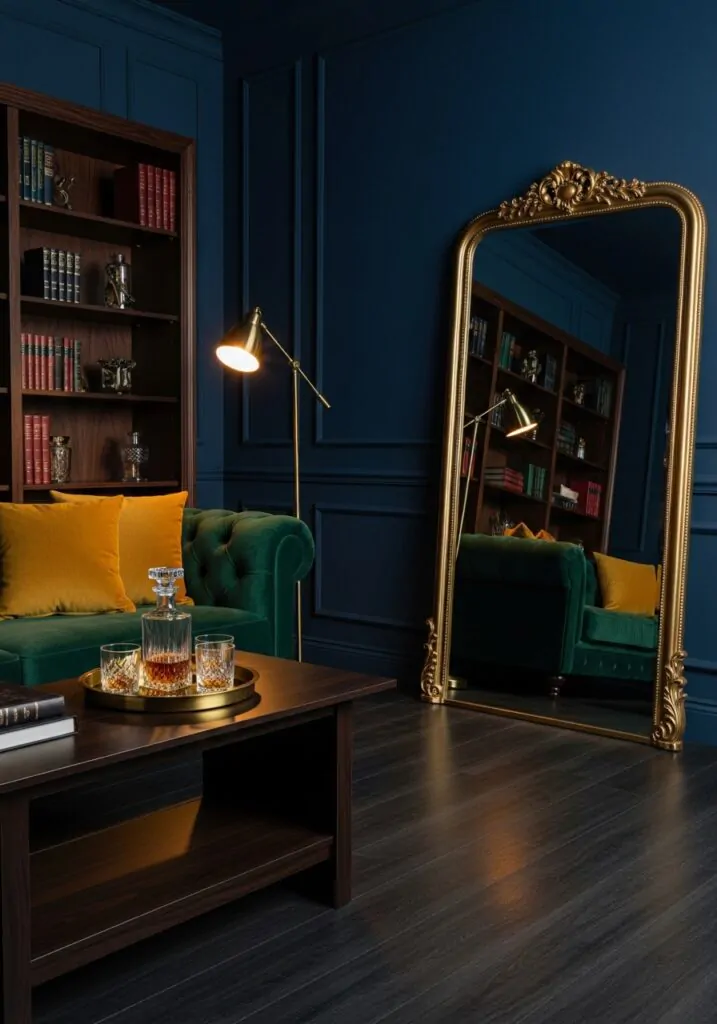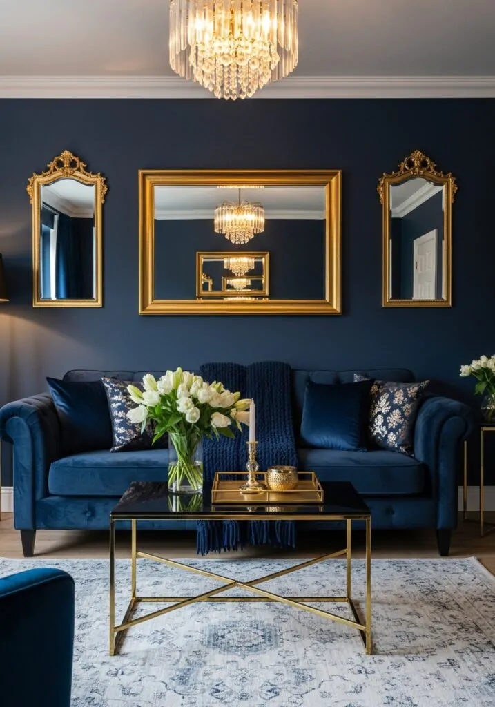 Mirrors are especially effective in darker rooms. They reflect light and visually expand the space. In a navy living room, mirrors prevent the color from feeling too heavy while adding elegance and depth. They’re both practical and decorative.