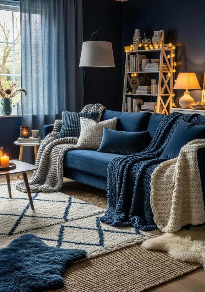 Navy can feel rich and bold, but texture is what makes it comfortable. Soft furnishings like plush upholstery, layered cushions, throws, and rugs prevent the space from feeling flat or cold. When you mix textures, navy becomes inviting instead of intimidating. The room feels lived-in, warm, and relaxed — the kind of space you actually want to spend time in, not just admire from a distance.
