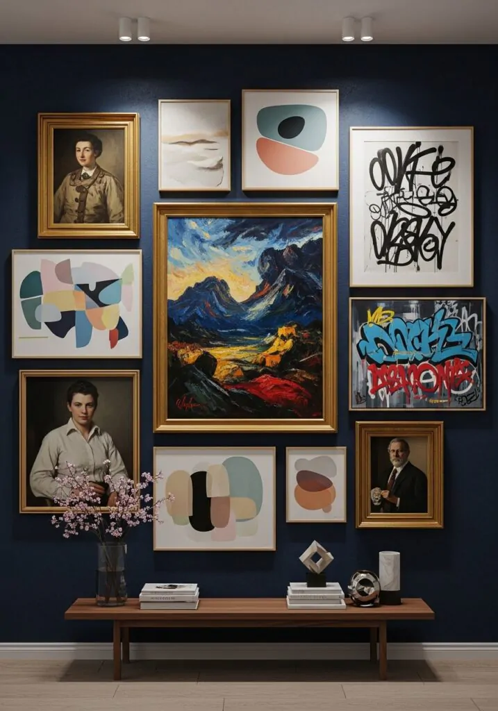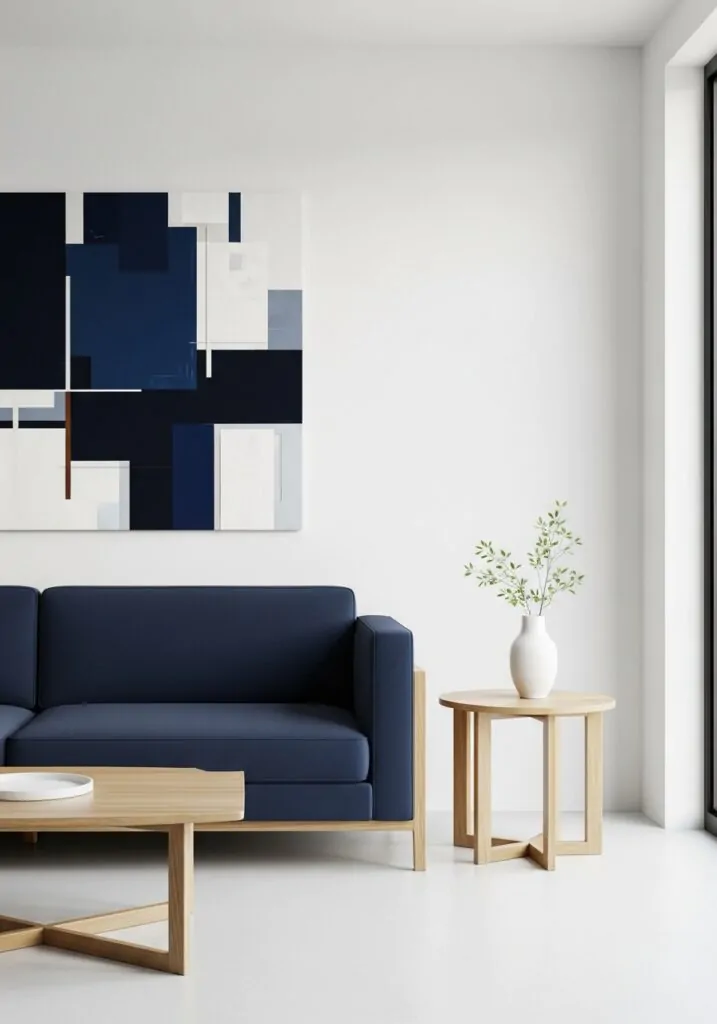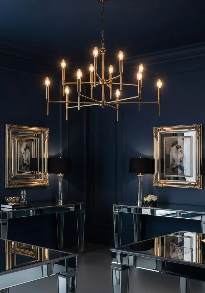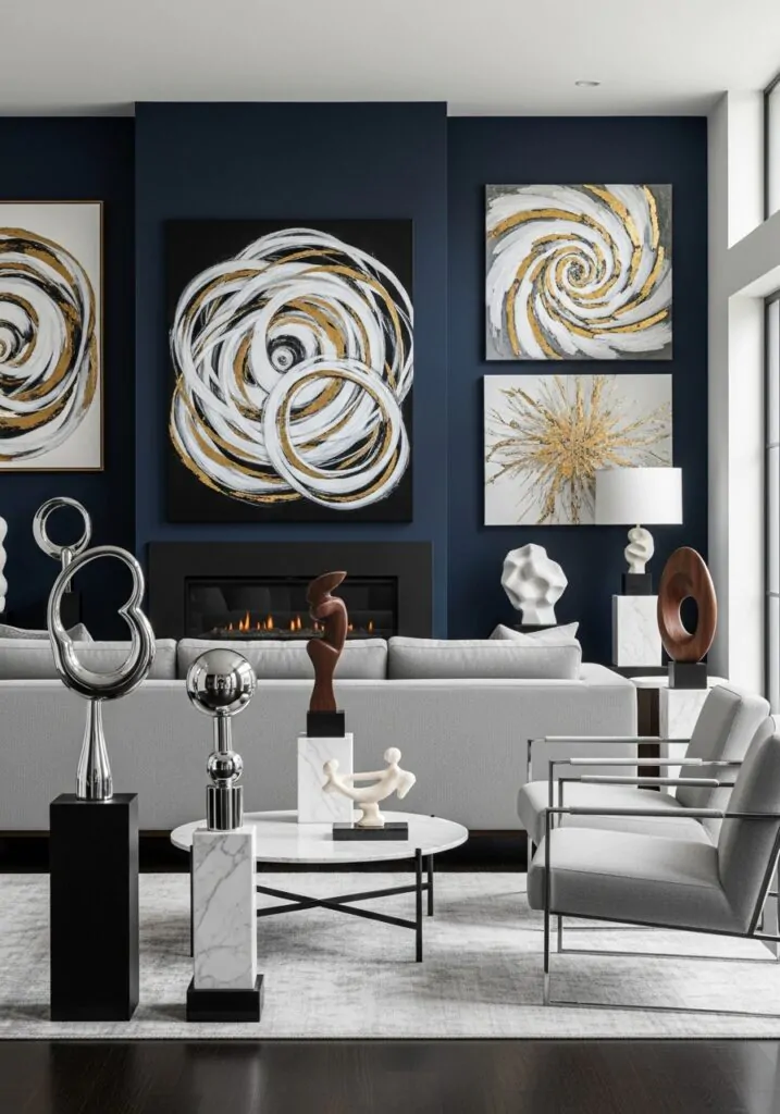 Modern decor pieces stand out against navy backgrounds. Clean lines and sculptural forms enhance the room’s sophistication. These elements add interest without clutter, keeping the design sharp and intentional.