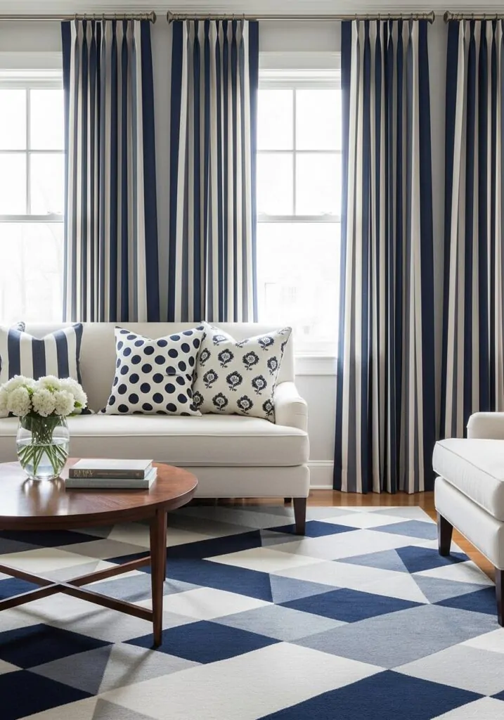 Patterns bring personality into a navy living room. They break up solid colors and add visual interest. Whether it’s through cushions, rugs, or curtains, patterns help the space feel expressive and layered. When kept within a coordinated color palette, patterns enhance navy rather than compete with it.