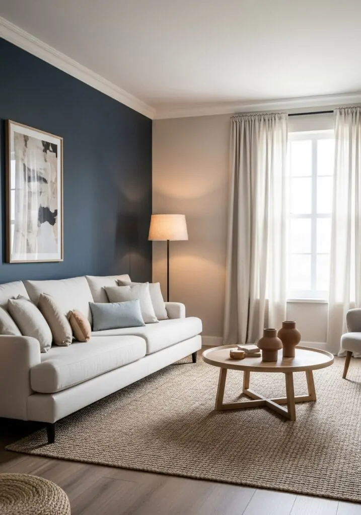 Soft neutrals help navy feel approachable. Shades like beige, ivory, and taupe lighten the mood and soften contrast. They keep the room from feeling too dramatic and help create a calm, welcoming atmosphere. Neutrals also make it easier to refresh the space over time without changing the main color scheme.