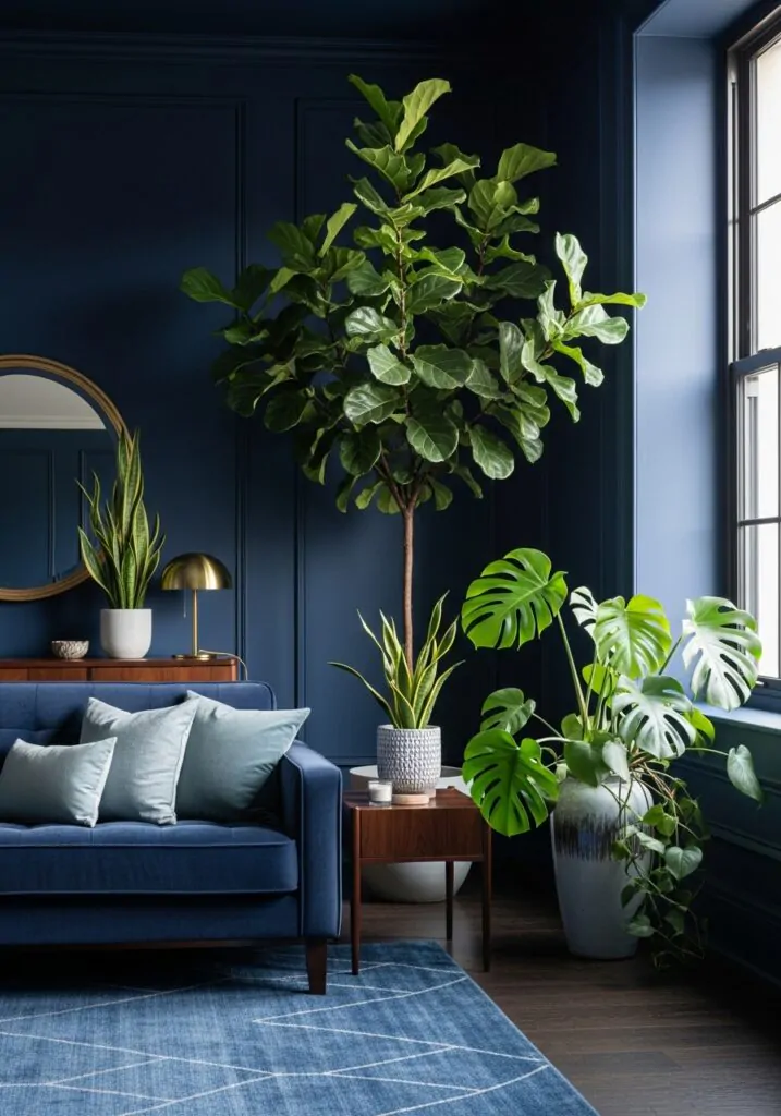 Greenery brings life into navy spaces. Plants soften the depth of the color and add natural contrast. Even a few plants can brighten the room and make it feel more balanced. They help navy feel fresh, vibrant, and connected to nature.