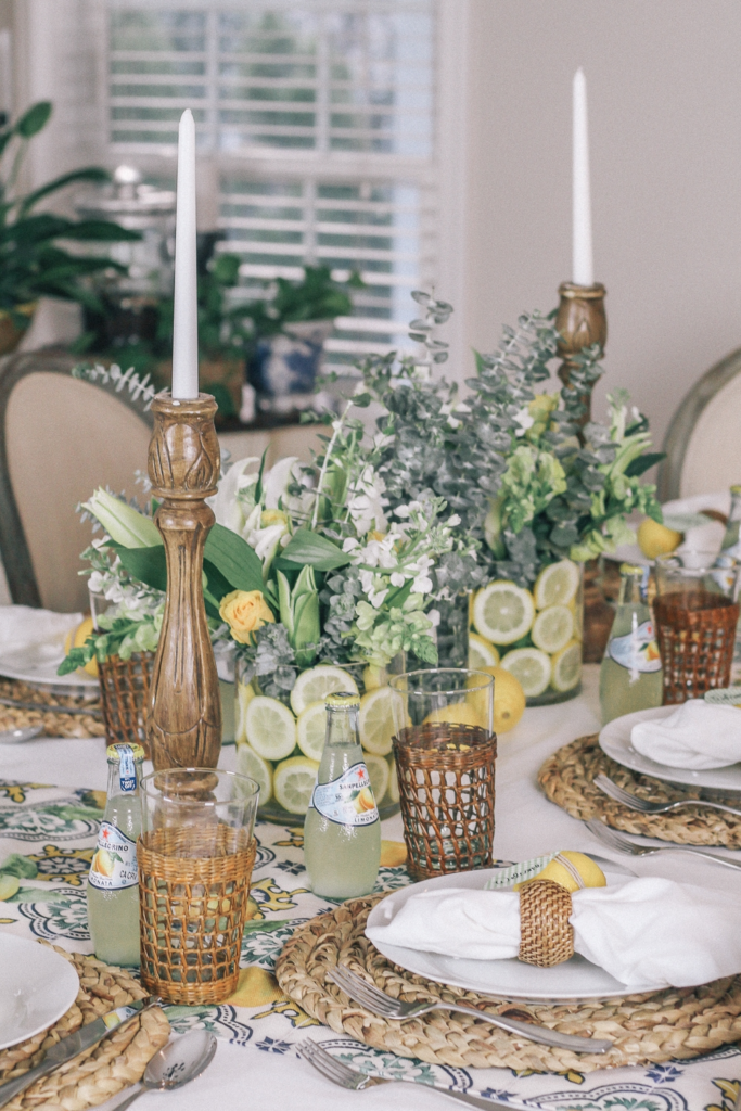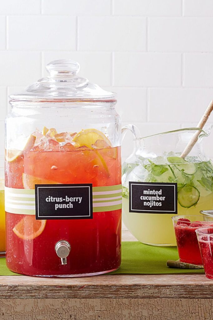 I set up drink stations based on a theme, like a mimosa bar, lemonade stand, or tiki bar. Providing all ingredients and accessories lets guests serve themselves while creating a vibrant, interactive, and themed focal point.