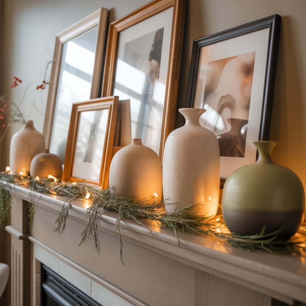 I treat mantels as display areas. I layer frames, vases, and seasonal items for a balanced look.