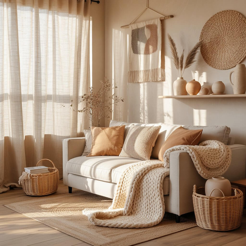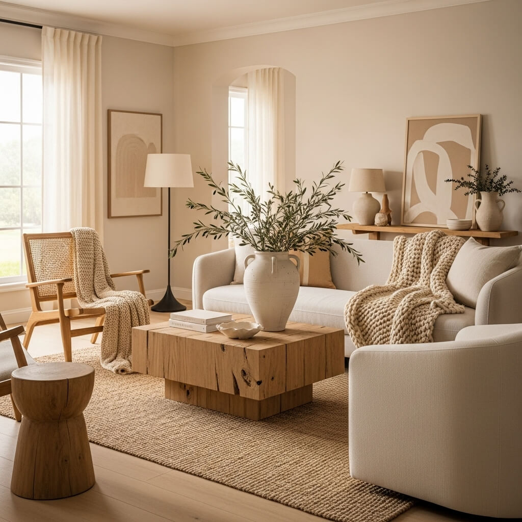 When I style this look, I focus on neutral shades like beige and warm white. I also add natural materials like wood and linen to keep the space grounded.