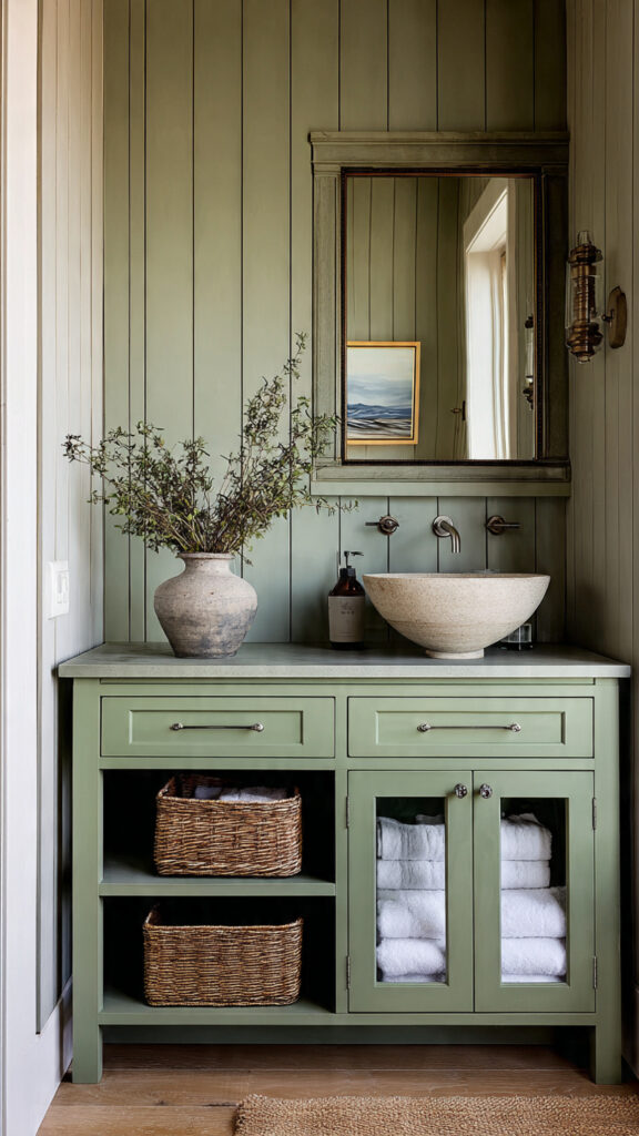 If you prefer a clean look, sage green still works. I’ve seen it paired with flat-panel cabinets and simple lines, and it creates a peaceful, spa-like environment. Adding a few plants makes a big difference here.