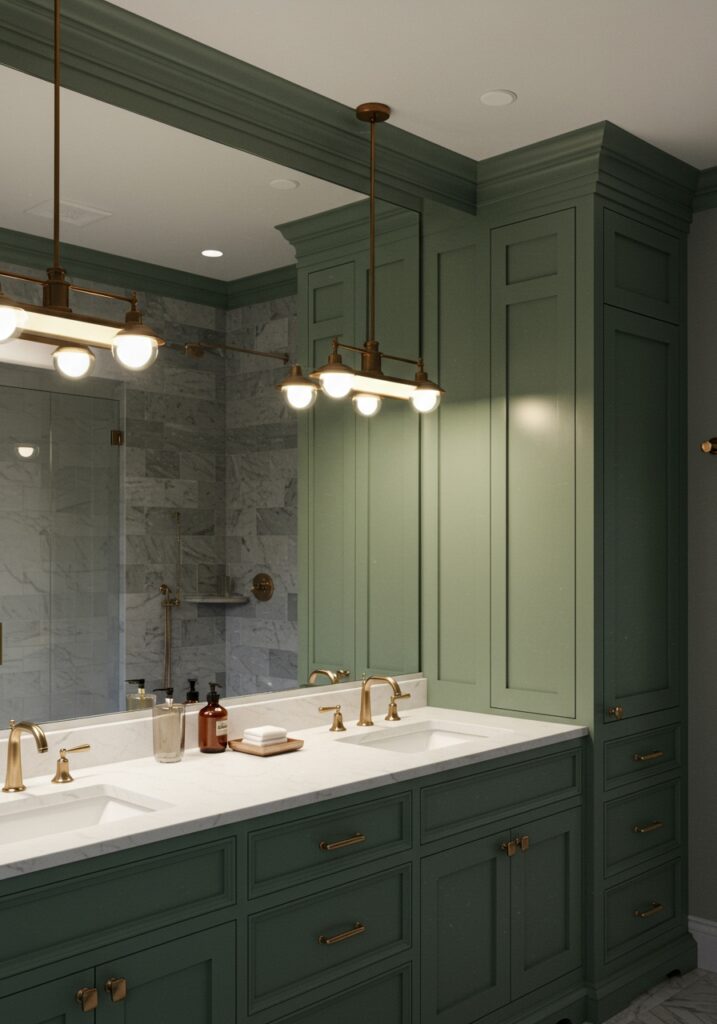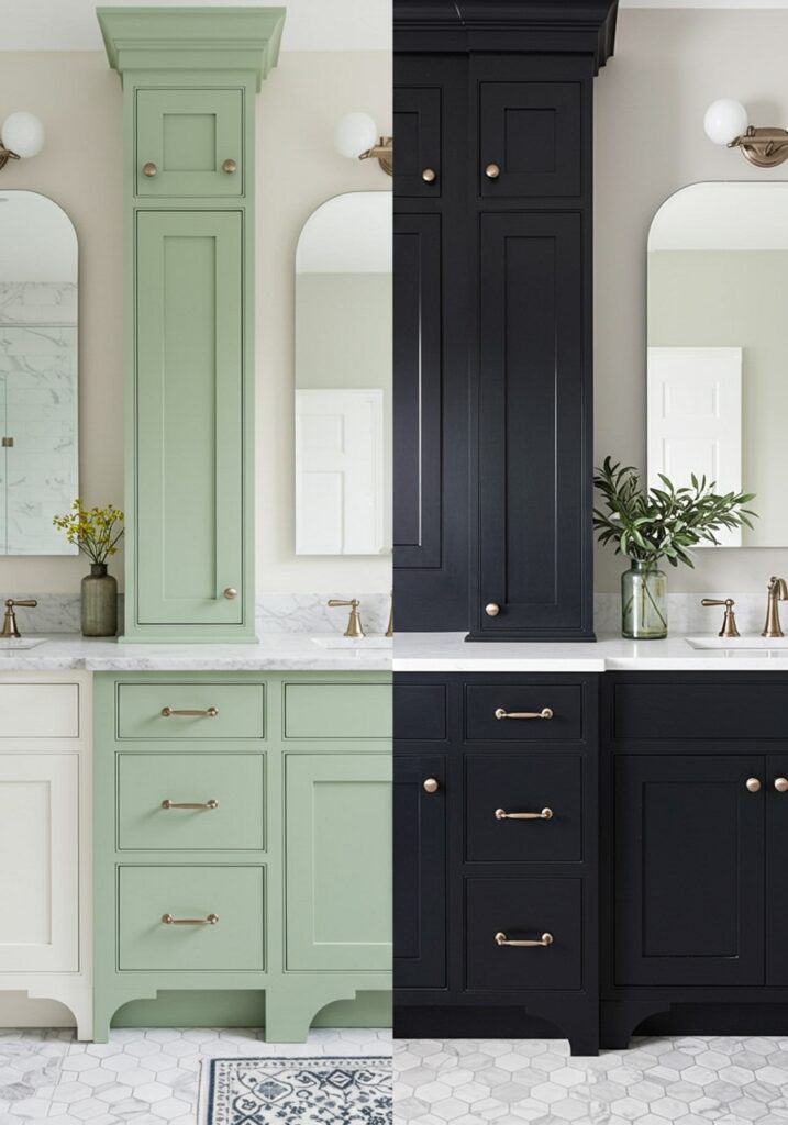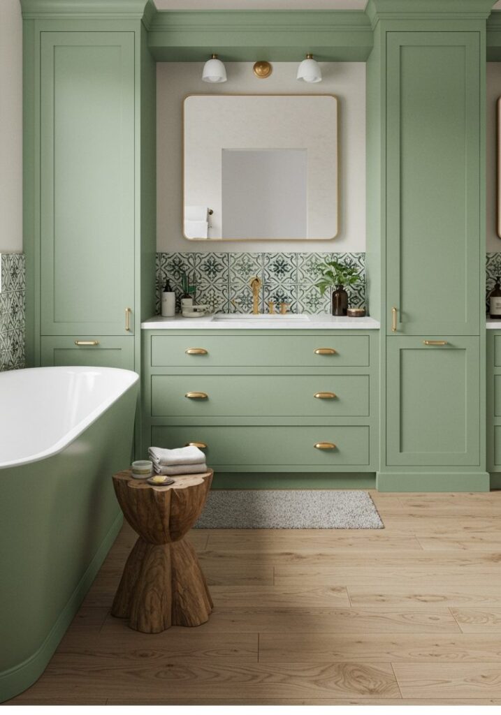 I’ve seen this setup look amazing. A sage vanity next to a freestanding tub creates a calm, spa-like feel. It’s simple but very effective.