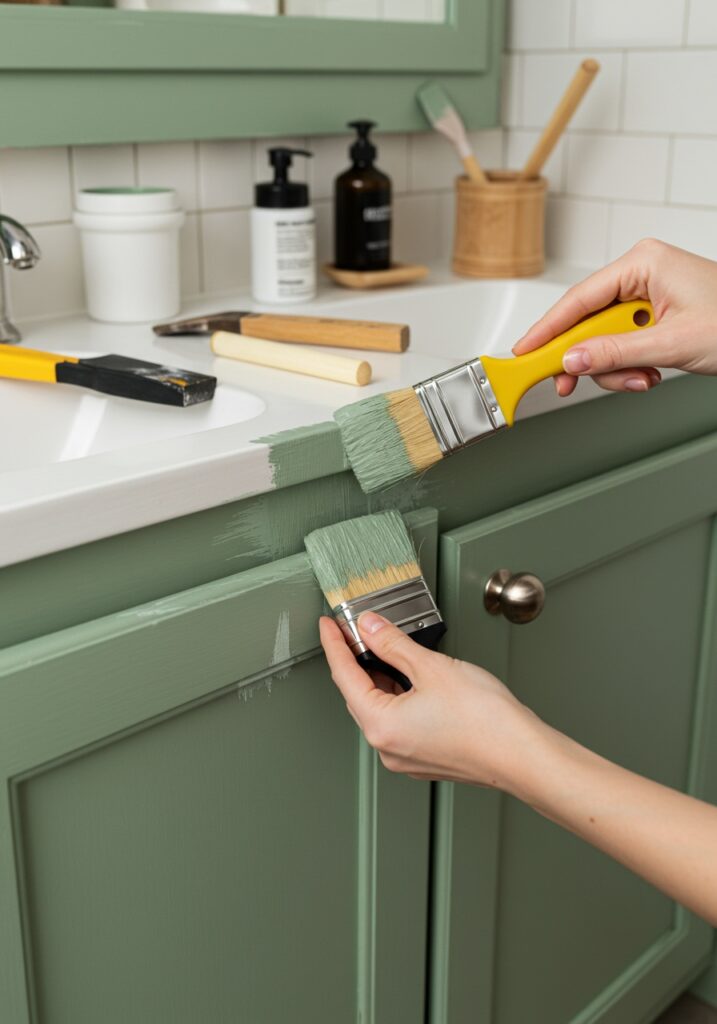 Painting existing cabinets is the most cost-effective option. Replacing just the vanity can also make a big difference. If you’re unsure, starting with smaller sage accents like shelves is a safe way to test the style.