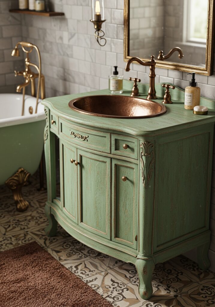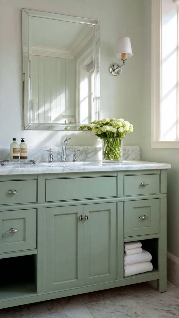 I’ve always liked vintage-style bathrooms because they add personality. A sage green vanity with carved details or curved legs works beautifully here.