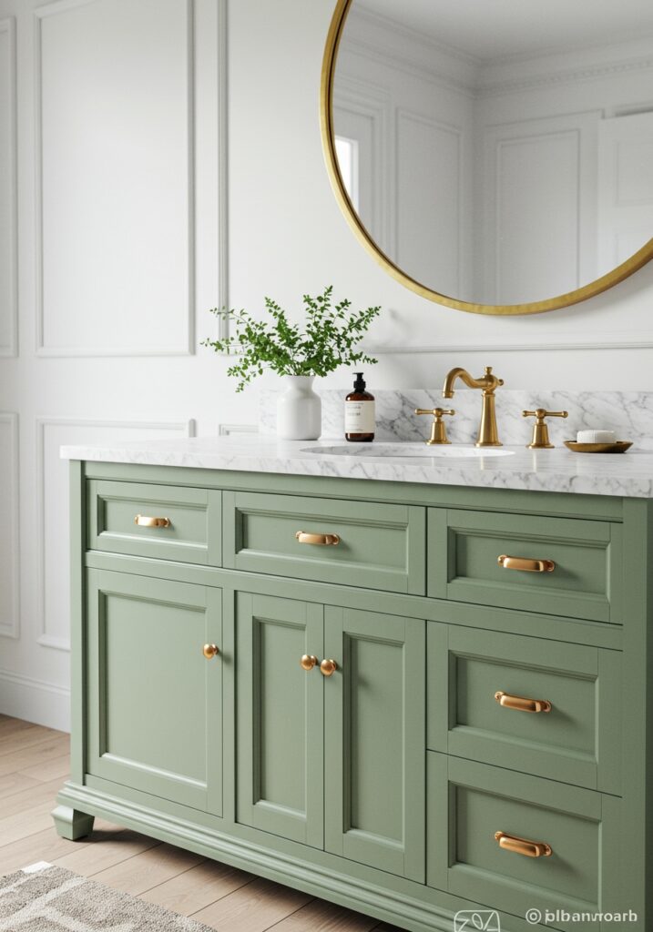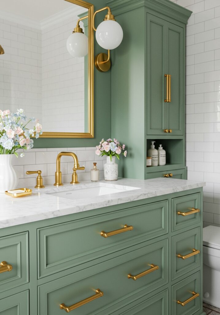 Gold handles and faucets instantly elevate the sage green base. I’ve noticed this combination works best when paired with white tiles and a statement light fixture above the mirror.