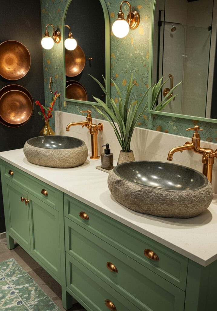 Stone vessel sinks or copper basins can completely change the look of the bathroom. Glass sinks also work well in modern spaces.