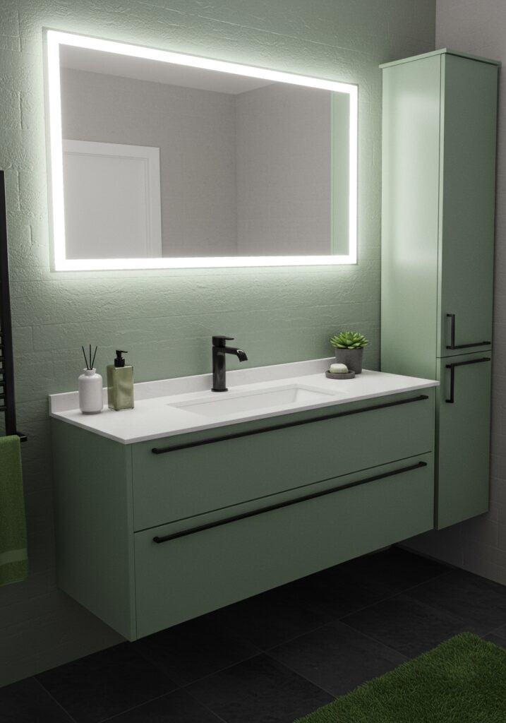 A compact sage vanity works well when combined with floating shelves or wall storage. A large mirror also helps visually expand the room.