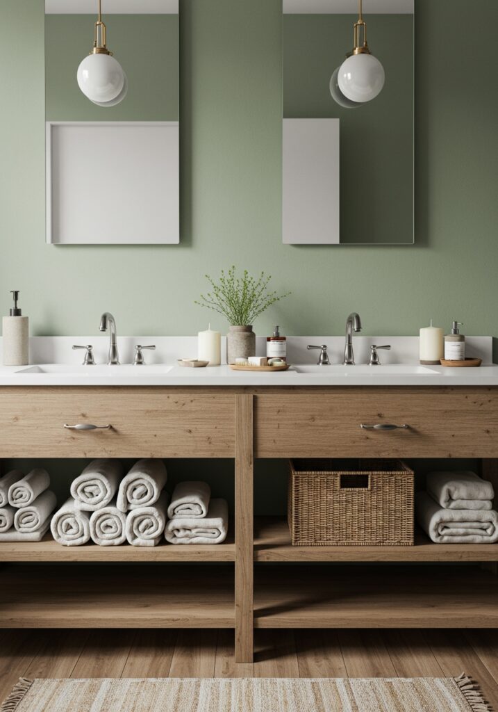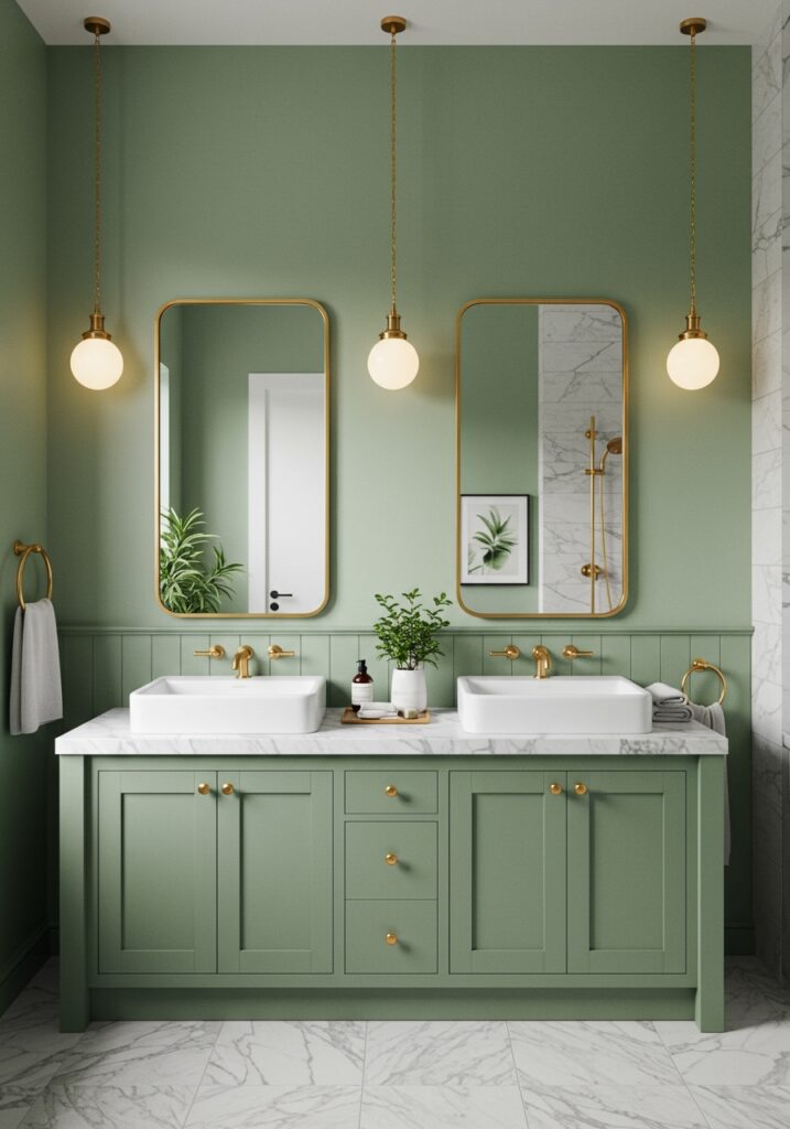 - Sage green vanities create a calm, spa-like bathroom atmosphere