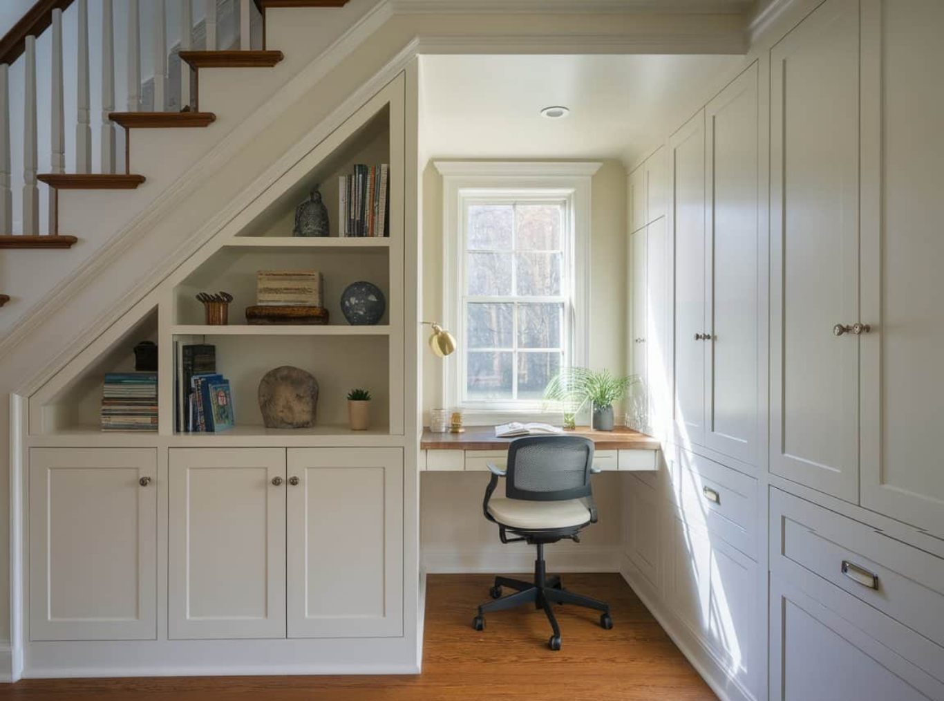 The space under stairs can be transformed into efficient storage with built-in cabinets or shelving. This setup keeps files, supplies, and electronics neatly tucked away while making use of an often-overlooked area. It’s a practical Hidden Home Office Storage solution that turns awkward spaces into functional assets.