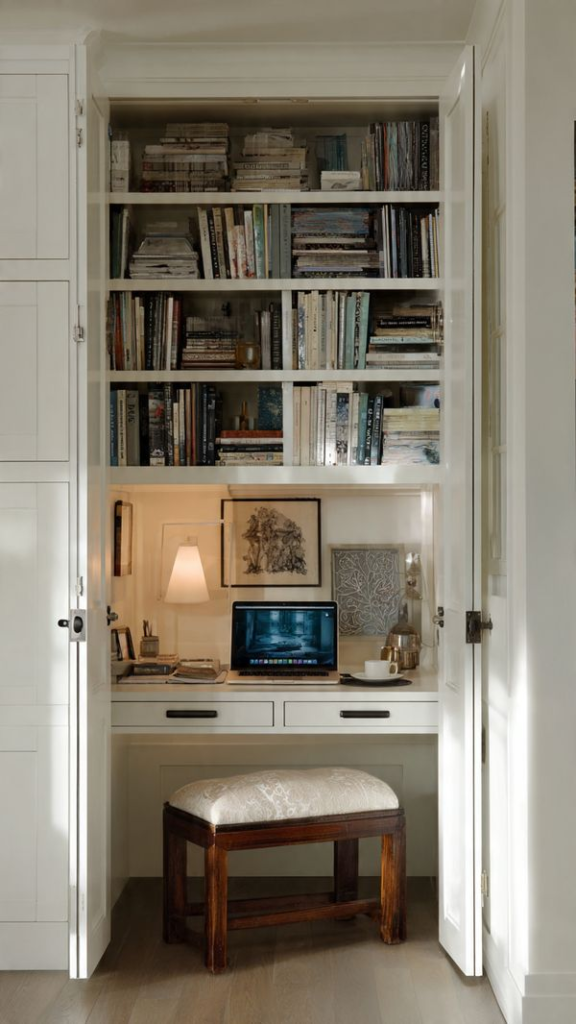Turning an unused closet into a home office is a practical solution for compact homes. A small desk, shelving, and proper lighting can transform the space into a comfortable work zone that closes away when not needed. This Hidden Home Office Storage option allows you to separate work from daily life without dedicating an entire room to an office.
