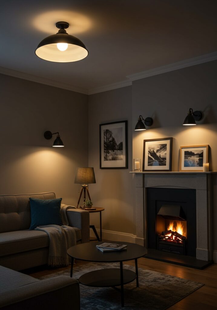 A fireplace adds warmth and glow, but it should not be the only light source. Layered lighting makes a small space feel complete. Start with overhead ambient lighting that evenly brightens the room. Add task lighting like floor lamps or sconces near seating for reading. Finish with accent lighting such as shelf lights or subtle uplights that highlight decor.