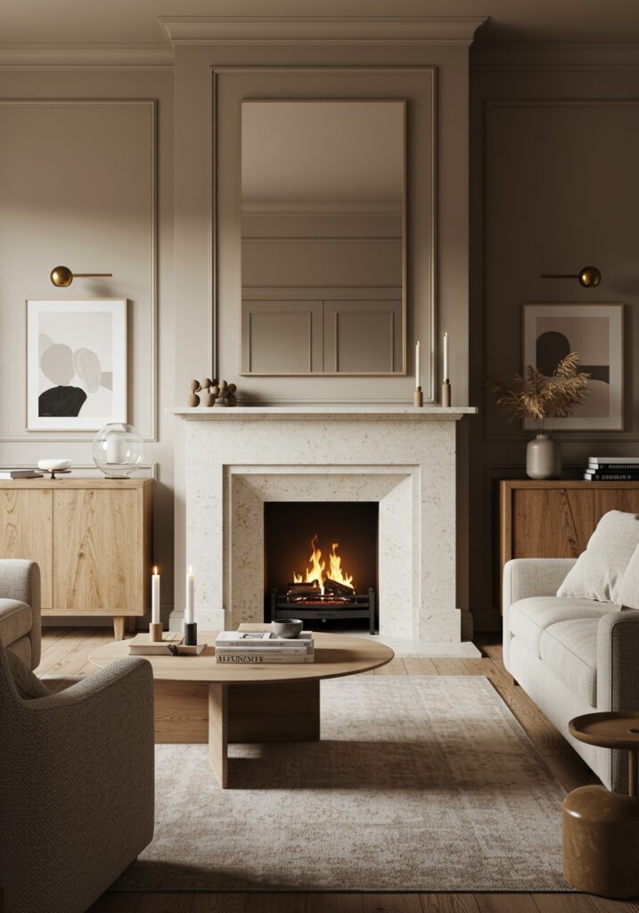 Color choices influence how large or small a space feels. Light, warm neutrals keep the room bright while complementing the fireplace’s glow. Instead of stark white, choose soft tones that add warmth. Incorporate natural materials like wood, textured fabrics, and woven accents to create depth without clutter.