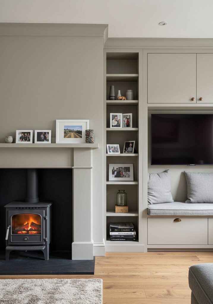 The wall that holds your fireplace is valuable vertical space. Adding shallow built-ins or shelving on either side increases storage without making the room feel heavy. Closed cabinets below keep clutter hidden, while open shelves above display decorative items in a controlled way.