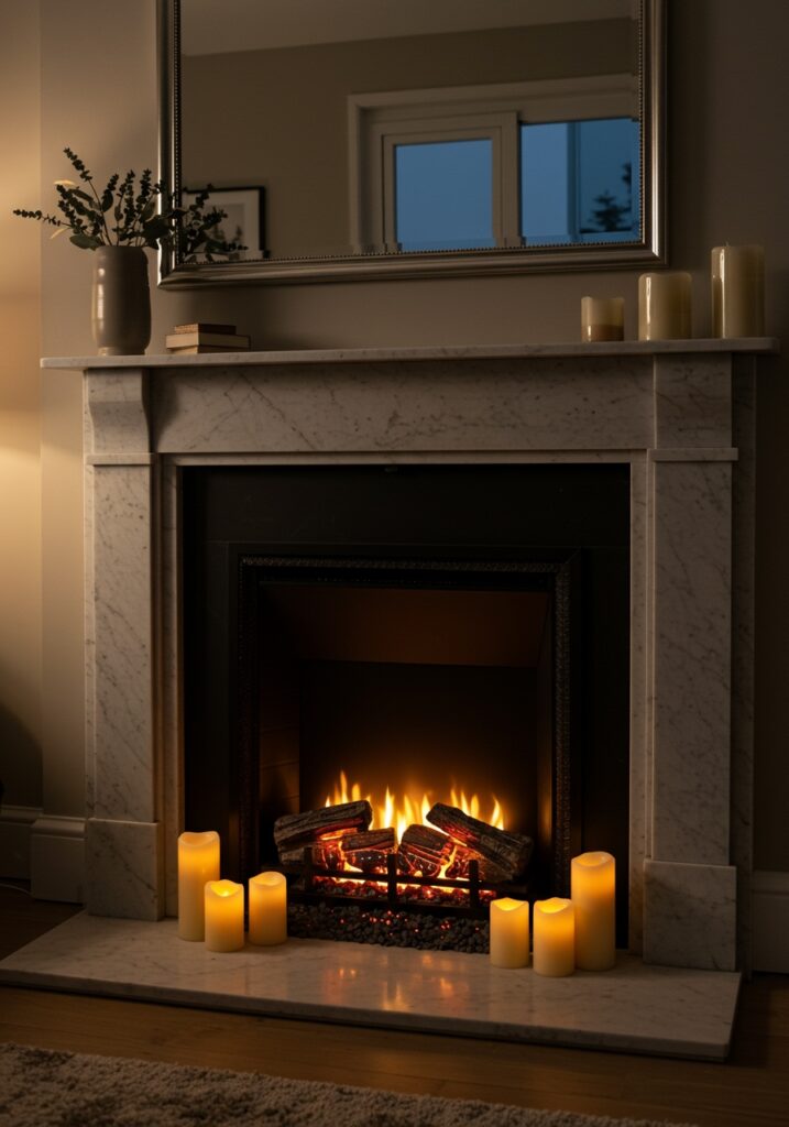 If you cannot install a permanent fireplace, there are still ways to create the effect. Plug-in electric mantel units form an instant focal point without construction. A compact electric stove tucked into a corner can create a cozy reading nook. Even grouping candles or placing LED logs inside a decorative surround can mimic the warm glow safely. These renter-friendly Small Living Room Ideas with Fireplace prove you do not need major renovations to achieve the ambiance.