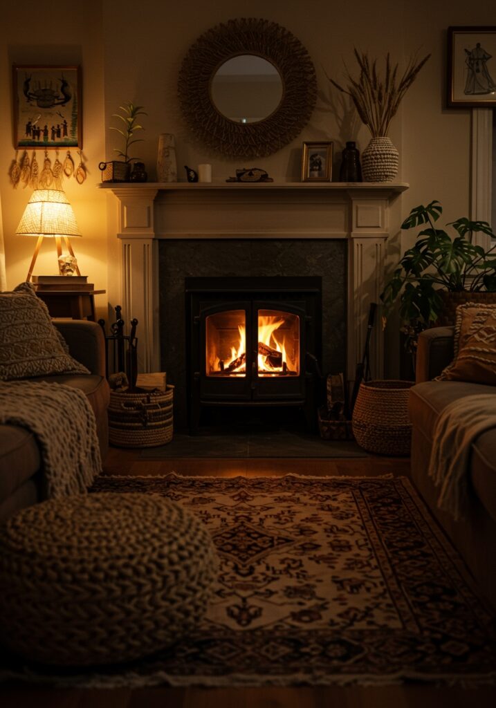 Center the layout around the fireplace and allow furniture to float slightly for better flow. Choose compact seating and flexible tables. Use vertical storage or slim consoles to flank the fireplace. Layer lighting for warmth and practicality. Stick to light, warm tones and add texture through fabrics and natural materials. Hang curtains higher and use large rugs to visually expand the room. Hide clutter inside multifunctional furniture. For rentals, rely on plug-in or decorative solutions to achieve the same cozy effect.