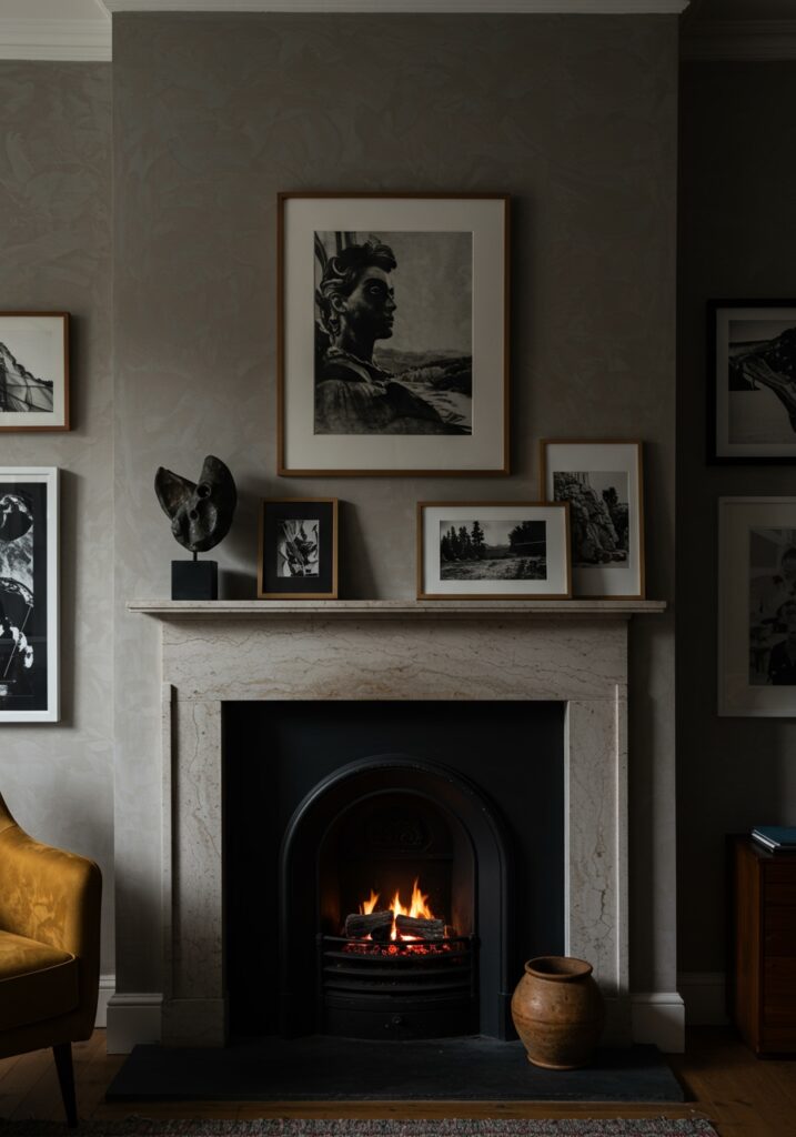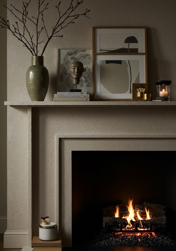 When styling the mantel, avoid overcrowding. Use a mix of heights and keep the arrangement balanced. A tall vase, a framed artwork piece, and a smaller sculptural object create interest without chaos. Limiting the number of items helps the fireplace remain the focal point while still adding personality.